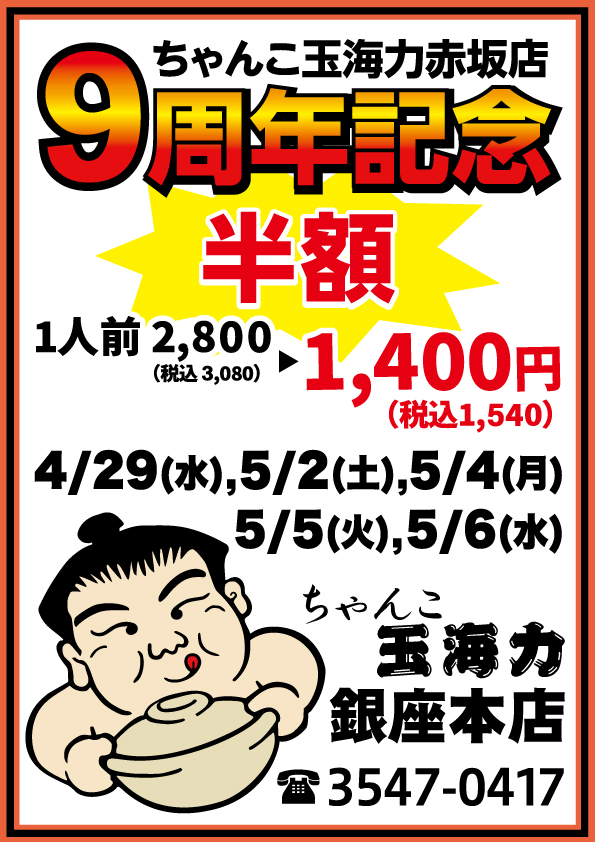 当店玉海力銀座本店も皆さまへの感謝気持ちと赤坂店の9周年を祝して、4/29(水)より当店自慢のちゃんこ鍋を半額にてご提供させて頂きます!!